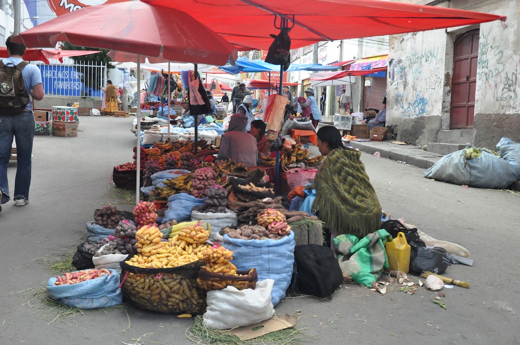 Small plastic bags of dried coca leaves and tea are sold at convenience stores, by street side vendors and at any marketplace. We first spot them during our Red Cap City Walking tour ($3). It takes us up narrow alley ways, through busy market places, to Plaza Murillo (Independence Square) and San Pedro prison. This prison is rather unique as it functions very much like a capitalist state, where inmates have jobs or run businesses, pay for their accommodation, services and food, and live with their families within the compound. (Read Marching Powder by Australian journalist Rusty Young for more on that.)