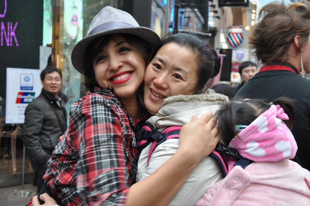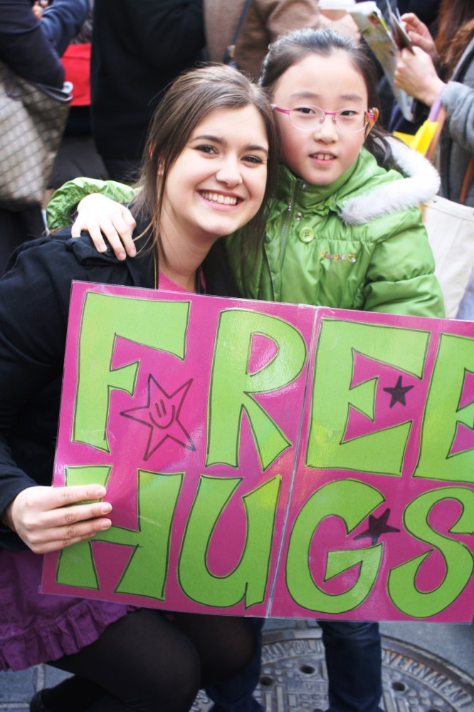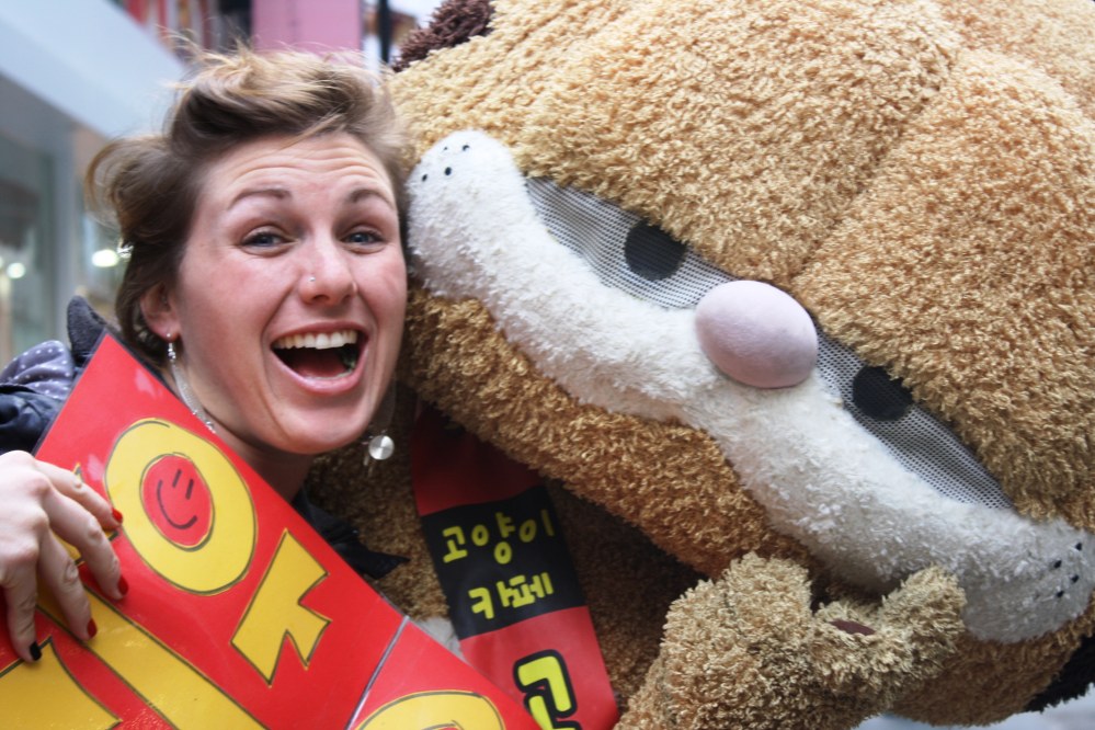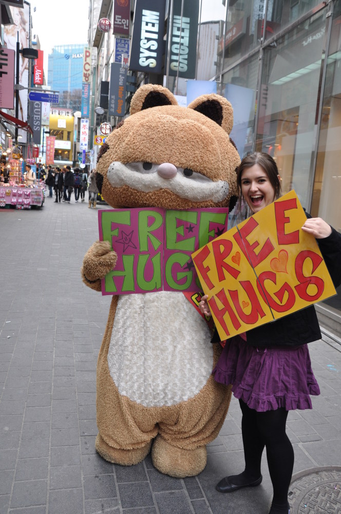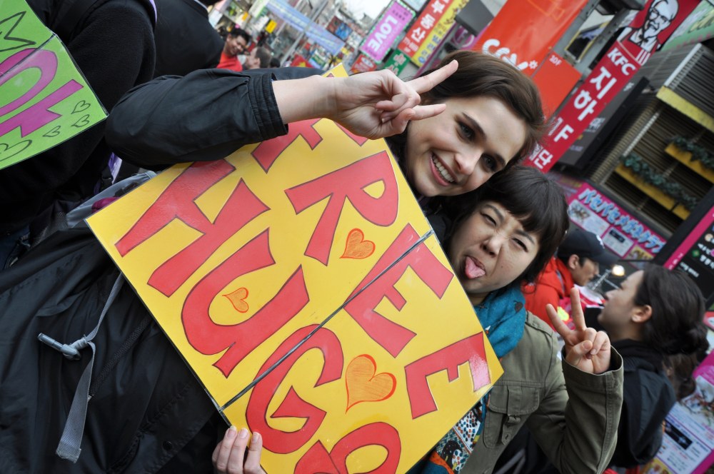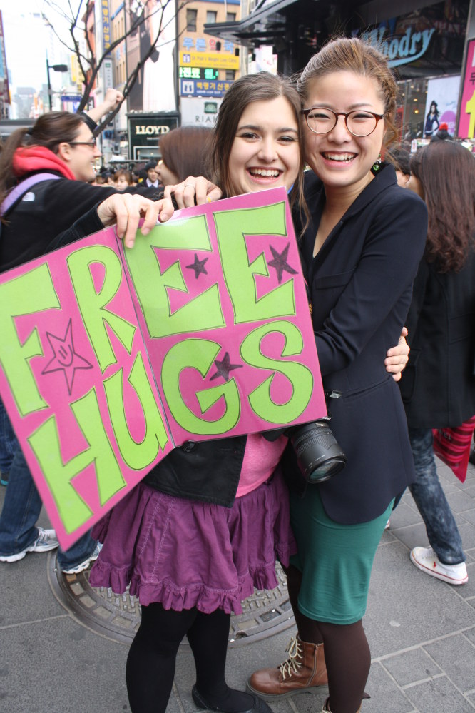 We held our multicoloured, handmade posters high above the heads of the Myeong Dong crowd. Despite our spelling mistake (in the Korean version) we were greeted with open arms. Those who didn’t want to give us hugs flashed smiles or gave us high fives. We came to realise that hugging and smiling go hand in hand.