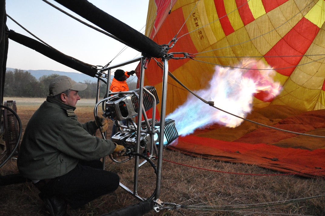 Brad, our commercial pilot for the hour-long flight, skilfully manoeuvres low enough for us to spot a hare on a boulder. A metre or two lower and I could easily jump out, if I wanted to. Zebras, Springbok and Blue Wildebeest weave their way across the landscape. They are unfazed by our presence, probably because they can’t hear our camera shutters. With a few controlled bursts of the burners the hot air balloon rises again, over the hill to our soft landing within Segwati Ranch.