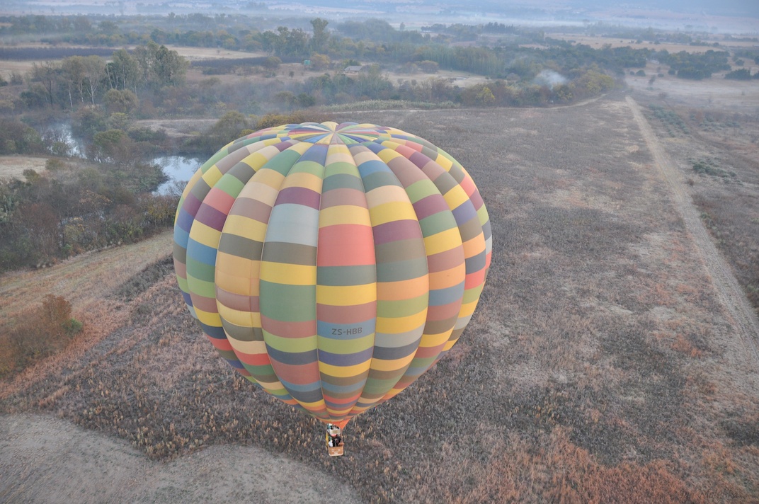 Silence. This is the place of morning calm, where I imagine the day that is to be, comes to collect its thoughts. Hundreds of metres above the treetops, the hot air balloon glides on the tail of the technicolour wind, at 14 knots an hour. A genteel mist lingers over the river meander that is hugged by autumnal hues and leads towards a patchwork of agricultural farms. The sun shows off its reflection in Hartbeespoort Dam on the horizon and once it rises high enough, I trace the balloon’s shadow across the rocky hill below. And to think that I am only 45 minutes away from Johannesburg’s northern suburbs.