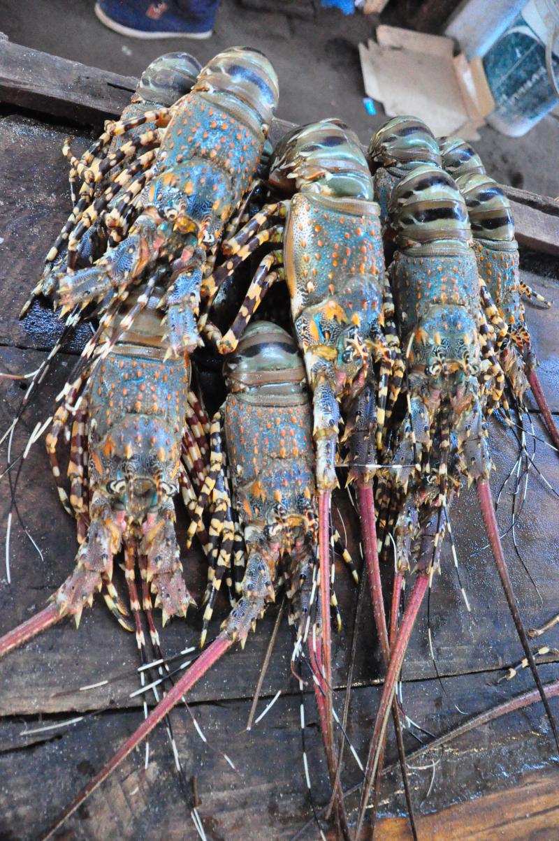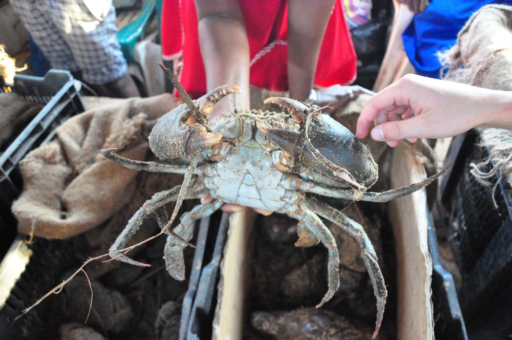 As I make my way up and down the rows of tables, the sellers spray the fish with water from plastic bottles with small holes in the lids to keep their scales glistening in the afternoon sun. They wave to attract my attention. “Madam,” they call as they lift up giant tiger prawns in a display of their size, “Good price for you today. How many you want?”