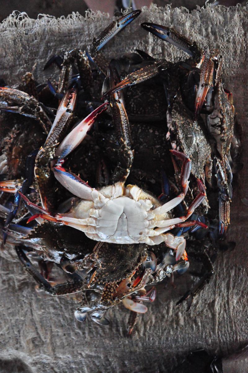 Back at the market – only a short walk along the beach from the Maputo Southern Sun Hotel where I was staying – the clams, prawns, shrimps, squids and octopi are placed into buckets of ice water to keep them fresh and cool in the tropical heat. The fish are displayed side-by-side on the newspaper-laden wooden tabletops. The crayfish are stacked one on top of the other with the biggest on top, so as to attract customers. And, indeed, they seem to be the biggest draw card – especially for the tourists – they go for around 300 meticals (around R100) per kilo. These crayfish are midnight blue at their pincers and brown at their tails; it’s only when they are cooked that the exoskeleton takes on a burnt orange and deep red hue. Crabs’ pincers are tied with strips of reeds and their cardboard boxes are covered with hessian cloth.