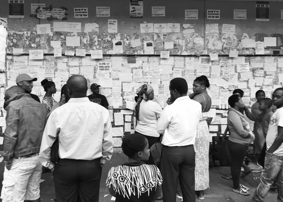 “This is an offline property listing, sort of like Gumtree,” explains Bijou, as we stand on the opposite side of the road at the Green Market. “Data is expensive in South Africa,” she says turning to the two German visitors on the tour. “And not everyone has the time to look online. After they’ve done their shopping in town those who live nearby come here to see what’s available.” We step closer. Most of the property adverts have been written in black maker on an A4 piece of paper. A few have been printed. For the most part there seems to be a mutual understanding that I won’t cover your notice if you don’t cover mine. There’s barely any space left on this palimpsestic community notice wall. Some notices are pasted just above the ground. Others are so high up I can barely make out the writing. But the writing on the wall says the same thing: many have followed opportunity to Joburg, some have been stalked by hardship. But many more will come. It is a city of money. It is the city of hope.